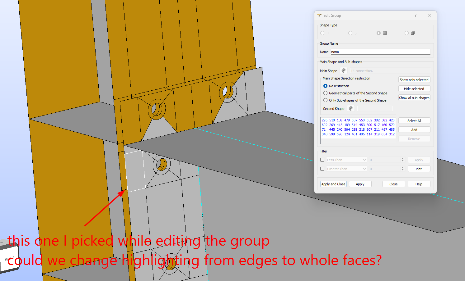 I was wondering if there’s a way of changing what is highlighted while adding to a group. When picked, now edges become white. If there are adjacent edges the result is seen only after applying changes. Then you have to edit and add the missing ones. It would be better to highlight faces, when we pick faces. And I can’t find any setting regarding that in geom settings. Could someone help me with that?