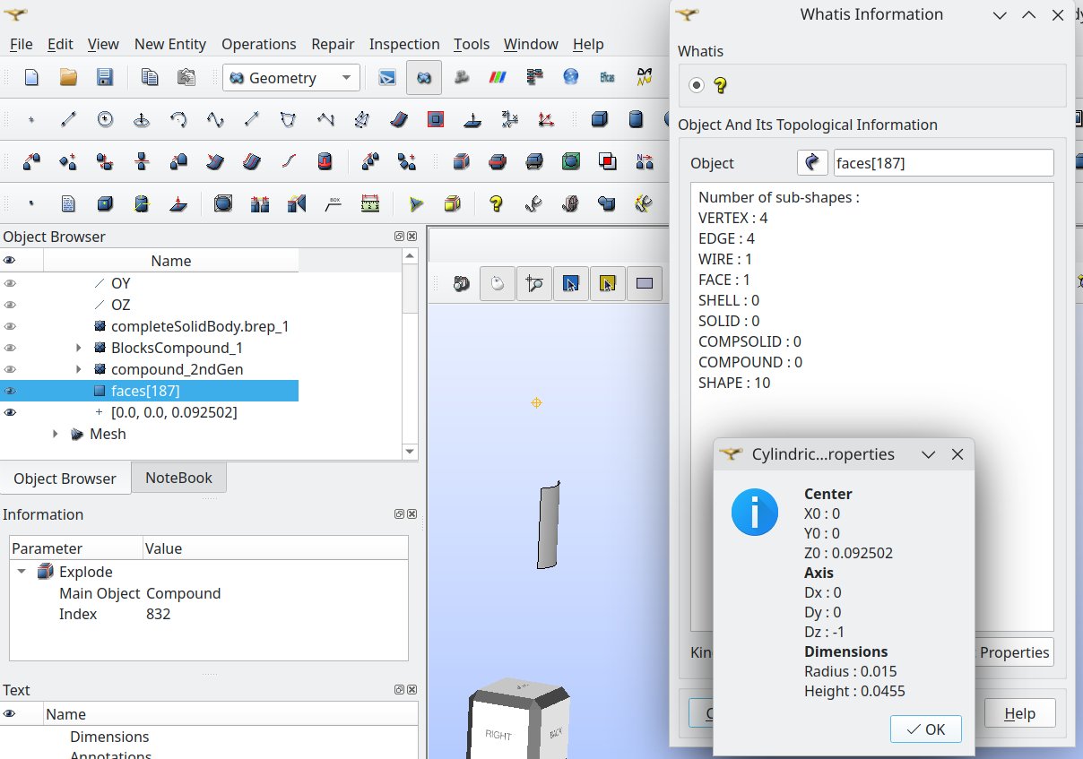 my issue is with the dx,dy,dz, which is negative, I wanted to re create the cylindrical face by creating a cylinder from 2 points and its directive vector, so,