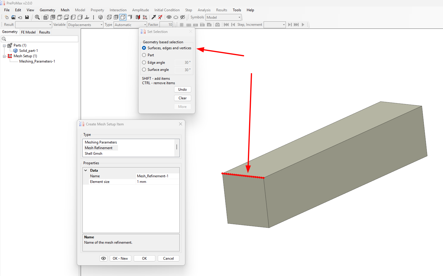Imagine you have a shell model consisting of 20 shells of different shapes, some openings, holes for bolts etc. What I’ve been doing to this point was naming all the edges in geom module, to apply hypotheses, mostly number of elements per edge to have a coherent fine structural mesh. Preparing model took ages. I wanted to speed up things, so I asked if there’s a way of picking the edges in viewport. It’s possible by selecting them in object browser, but only when you explode the model. But this gives no advantage, now I’m getting list of edges, and no one knows which is which. Now you’re proposing to name the edges in geom module. So, we are where I started. Meanwhile in PrePoMax (that’s why I’m amazed it doesn’t work like that, I don’t mind naming groups for slolver, but edges for mesh refinement???):